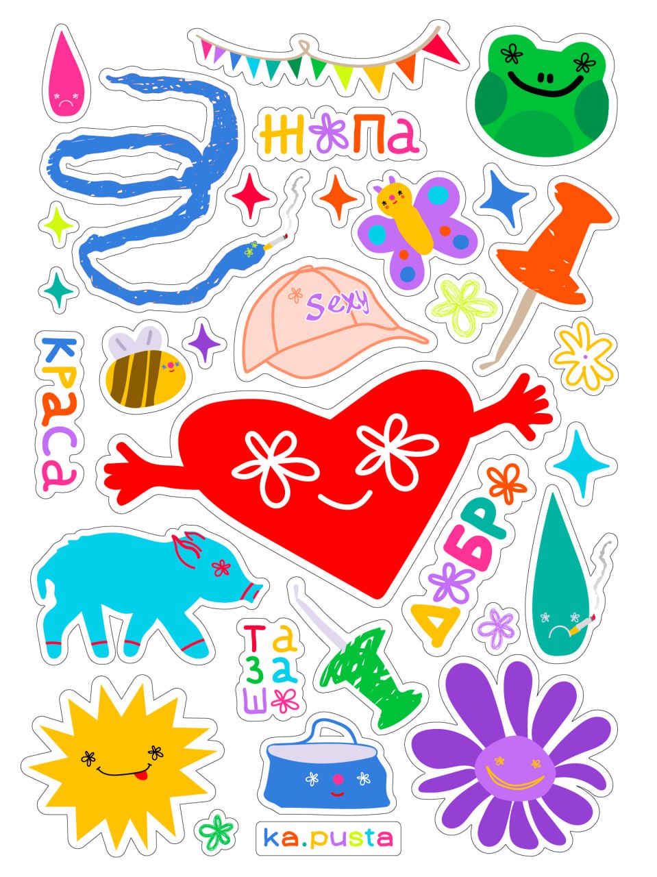 The main inspiration for creating new stickers is children and their confidence. Children are not afraid to do their hair or dress brightly, they have a rich imagination and have no limits in their imagination. With the help of her stickers, the author wants to remind everyone of their childishness, sunshine, brightness and warmth.