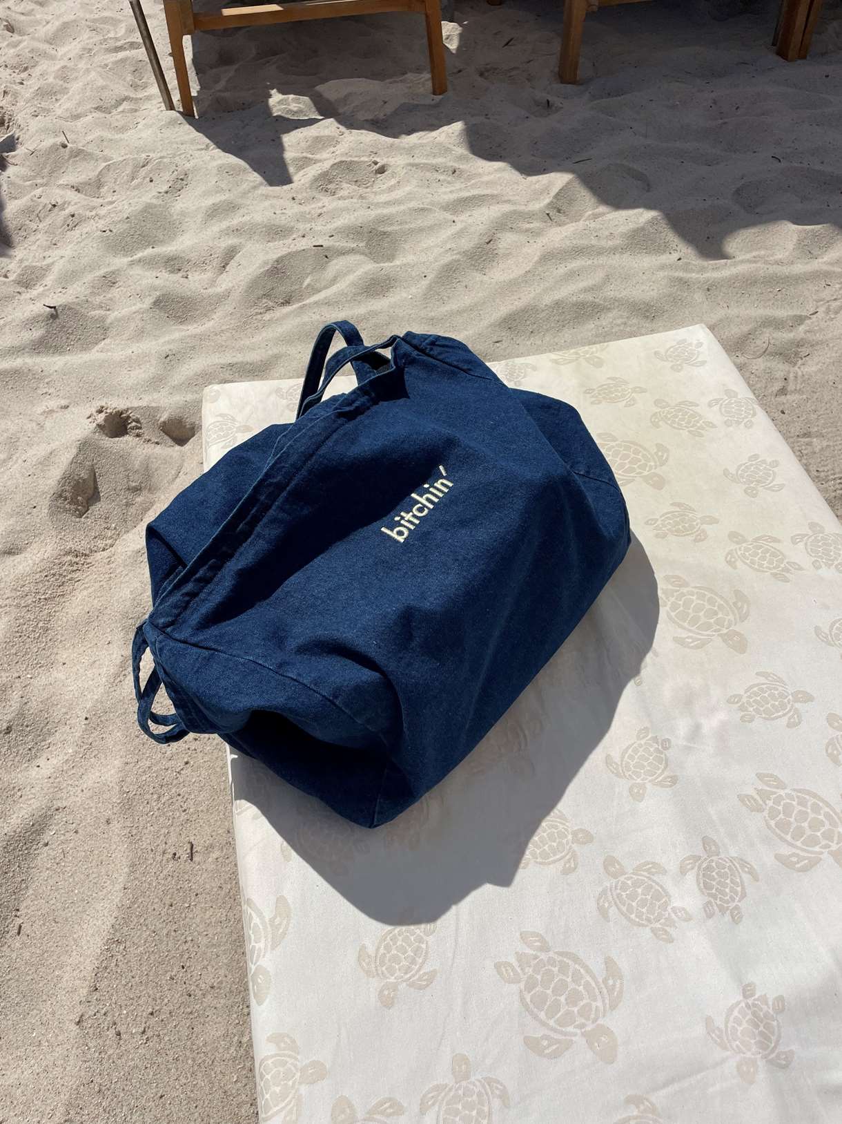 Embroidered “Bitchin’” lettering. The tote bag closes with a zipper.