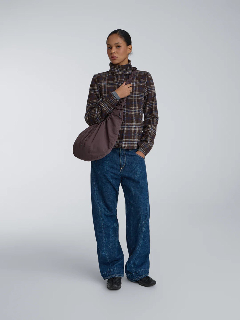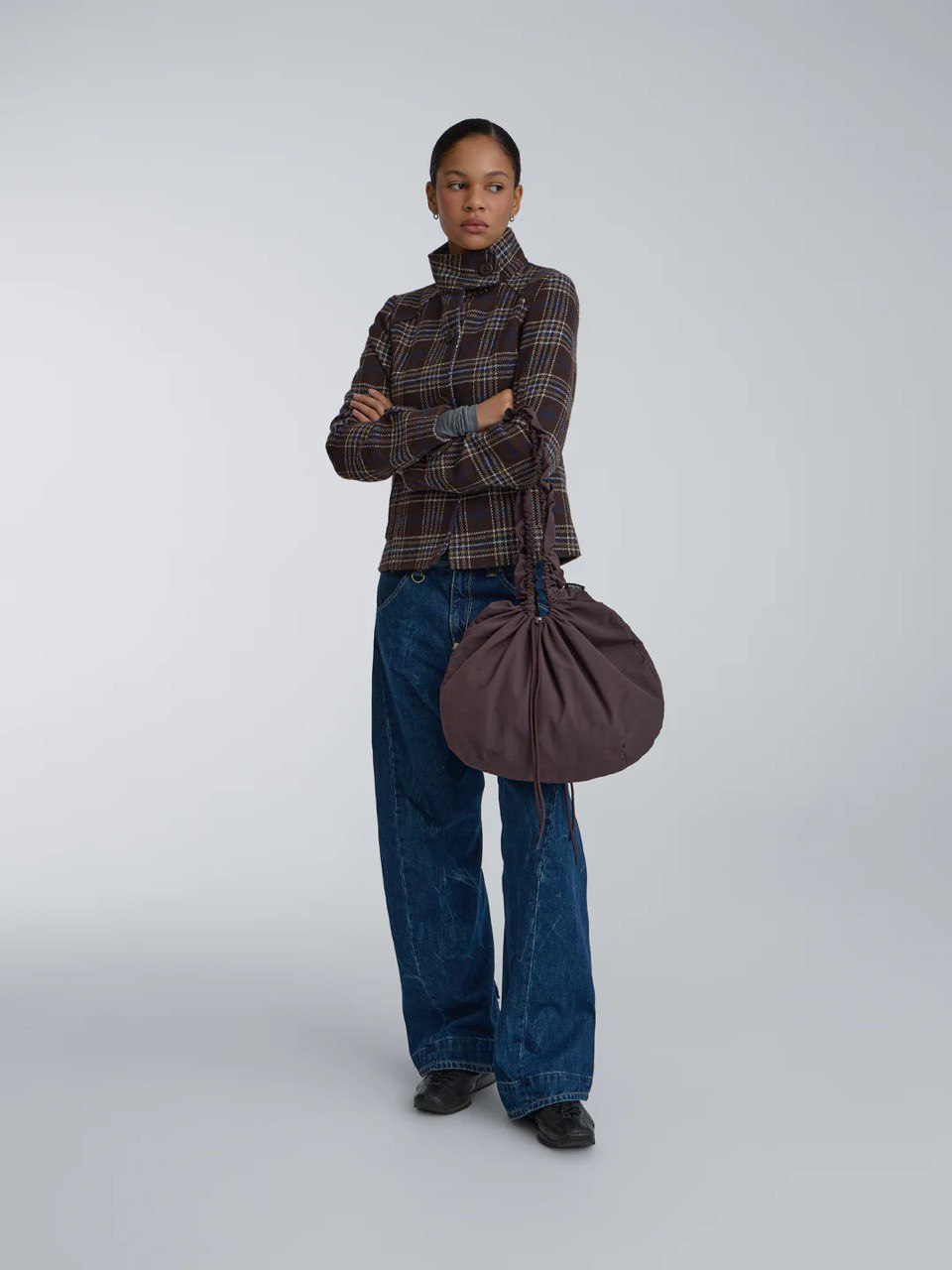 This functional raincoat-style bag is a perfect addition to your everyday routine this season. Available in four colors: brown, black, mocha, and light gray. The bag length is adjustable with stoppers, complementing the minimalist design of the model.
