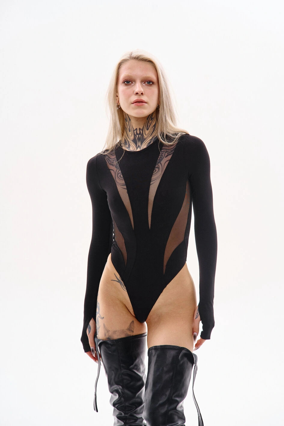 A bodysuit made from a combination of stretch coolmax and transparent mesh, which fits well thanks to its anatomical cut and mesh inserts, emphasizing the figure. Sleeves with finger holes add comfort and style.
