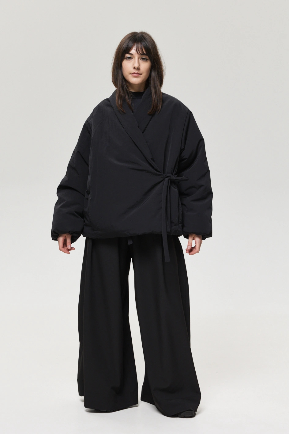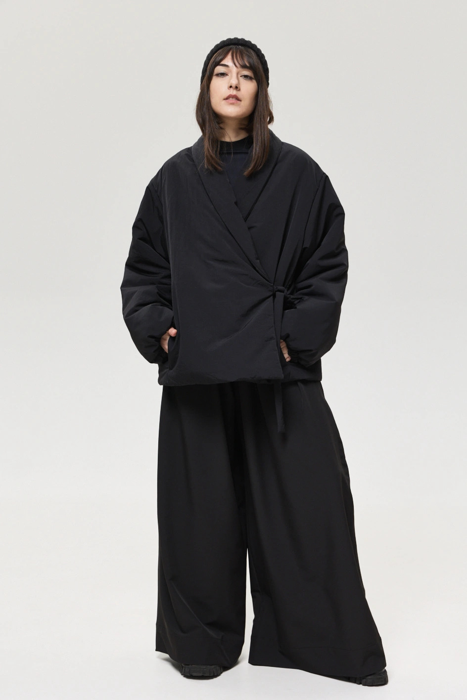 The kimono-style jacket is ideal for spring weather thanks to its light synthetic insulation. It has a standard length and ties made of the main material for a comfortable fit. The model has five pockets: two external zippered pockets, two internal patch pockets, and one internal slit pocket with a flap.