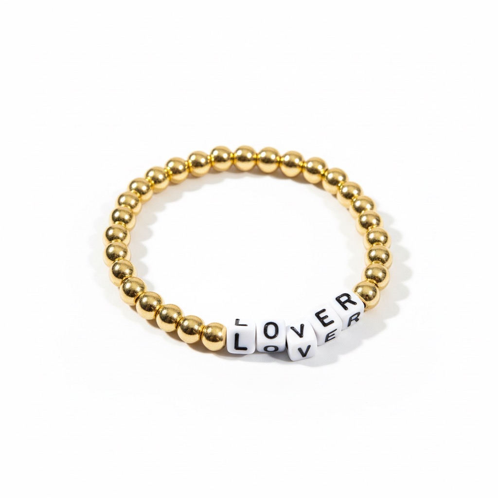 Браслет на резинці із бусин гематиту та акрилових літер.
