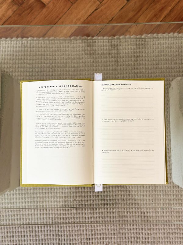Структура: ранкові та вечірні питання, щотижневі практики та 60 вільних сторінок в кінці для записів.