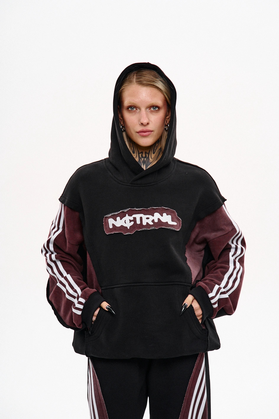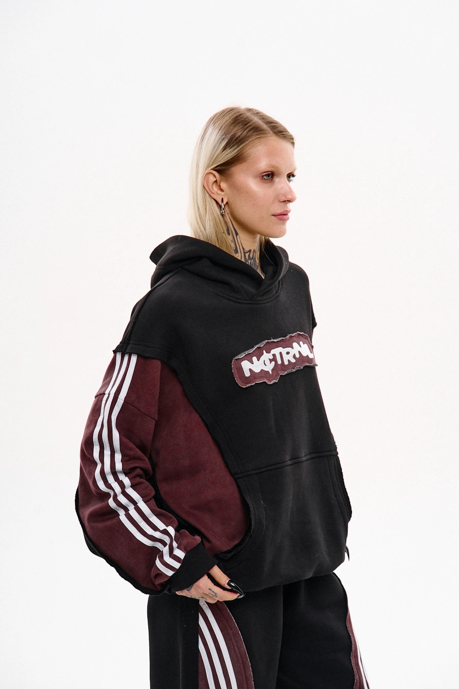 Худі оверсайз крою з унісекс посадкою. Місця з’єднання тканин — з необробленими швами для ефекту необробленості. Виріб пройшов промислове прання, що створює вінтажний ефект і м’яку тактильність. На рукавах — білі лампаси, які імітують естетику старих спортивних костюмів. Манжети та низ виробу — з щільної рібани для надійної посадки.