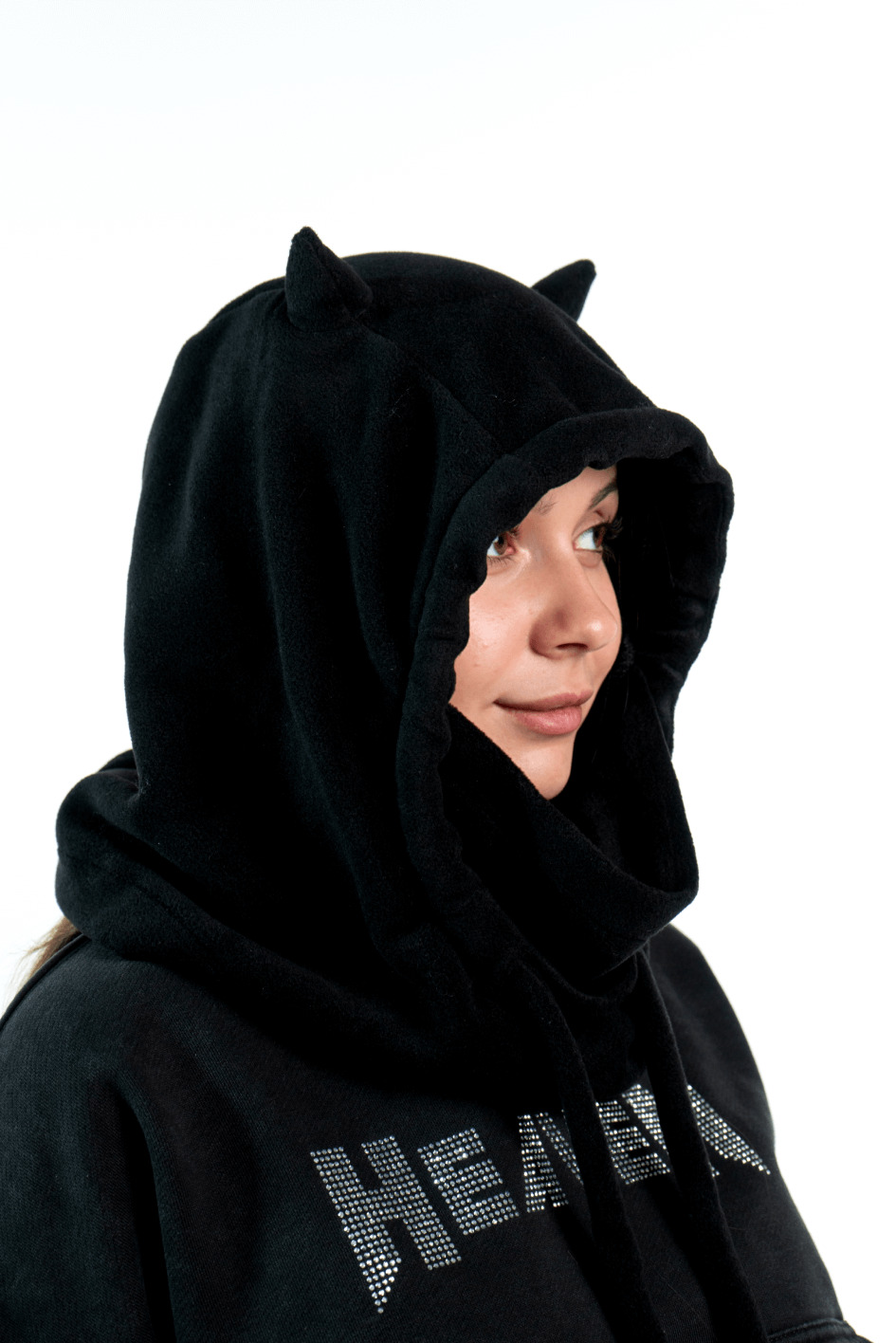 - Капюшон з м'якої тканини з декоративними рожками.