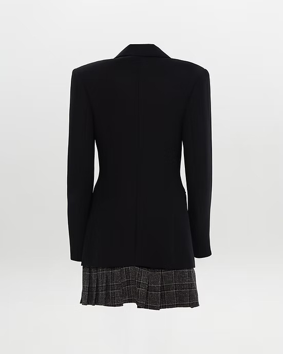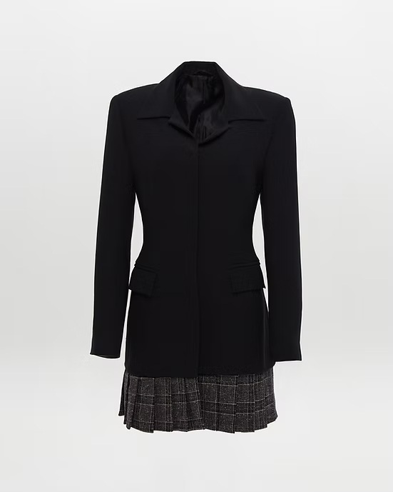 Приталений чорний жакет із виразним силуетом та оздобленим подолом у вигляді спідниці. Контраст матеріалів додає глибини образу: основа з полієстеру забезпечує чітку форму, а вовняний поділ - фактурність і м’який рух.